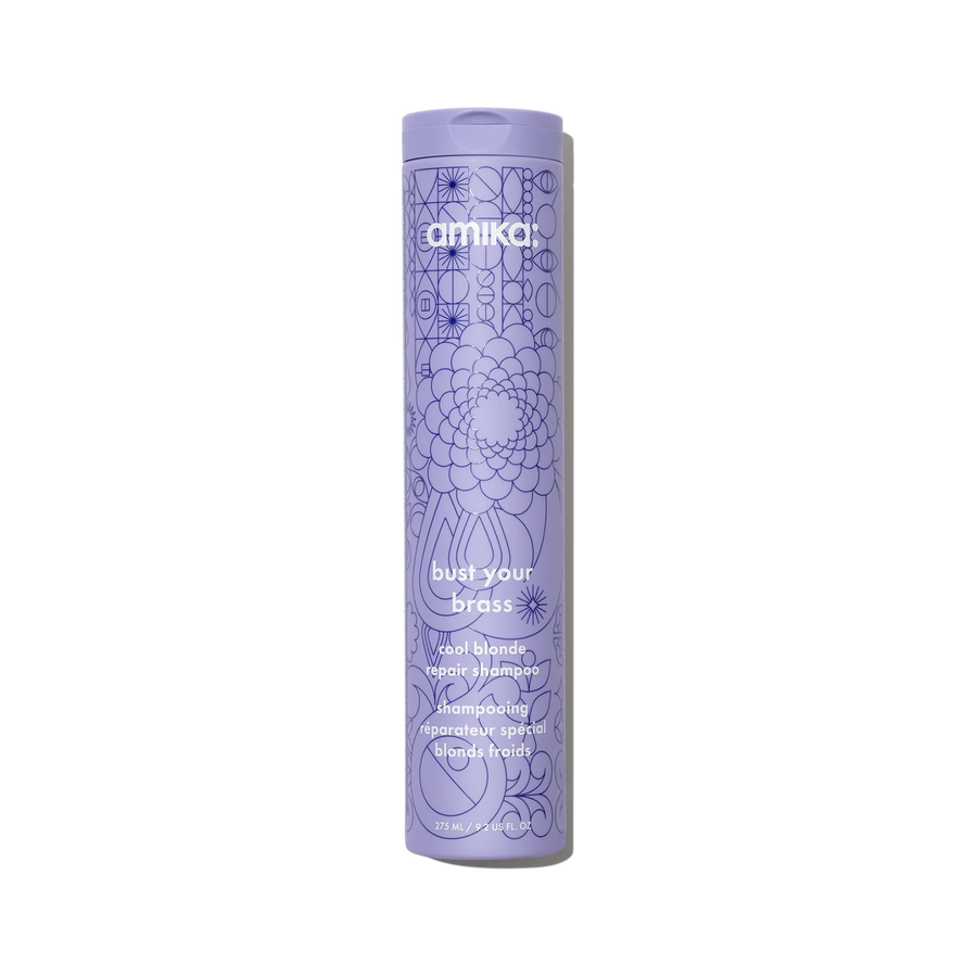 Elevate your blonde, silver, or gray haircare routine with Amika Bust Your Brass Cool Blonde Repair Shampoo, the ultimate solution to toning unwanted brassy hues while delivering 7x more repair, 55% less breakage, and stronger, healthier-looking locks. Suitable for all blondes, grays, and silvers (1-4c) and high porosity hair, this purple shampoo harnesses the power of bond cure technology, quinoa protein, plant butters, and ultraviolet pigments to keep your blonde looking cool and resilient. Clinically proven to tone, hydrate, strengthen, and repair hair, this shampoo brightens and tones, banishing brassy hues for the brightest shades of blonde, silver, and gray. Customize your Bust Your Brass routine based on your blonde type, from natural to platinum or colour-treated, with personalized suggestions to maintain your desired tone. Packed with bond cure technology, plant butters, vegan proteins, and ultra-violet pigments, this product is gluten-free and your key to maintaining a vibrant, toned, and healthy blonde. (*After 1 use when used as a system, clinically tested.)
