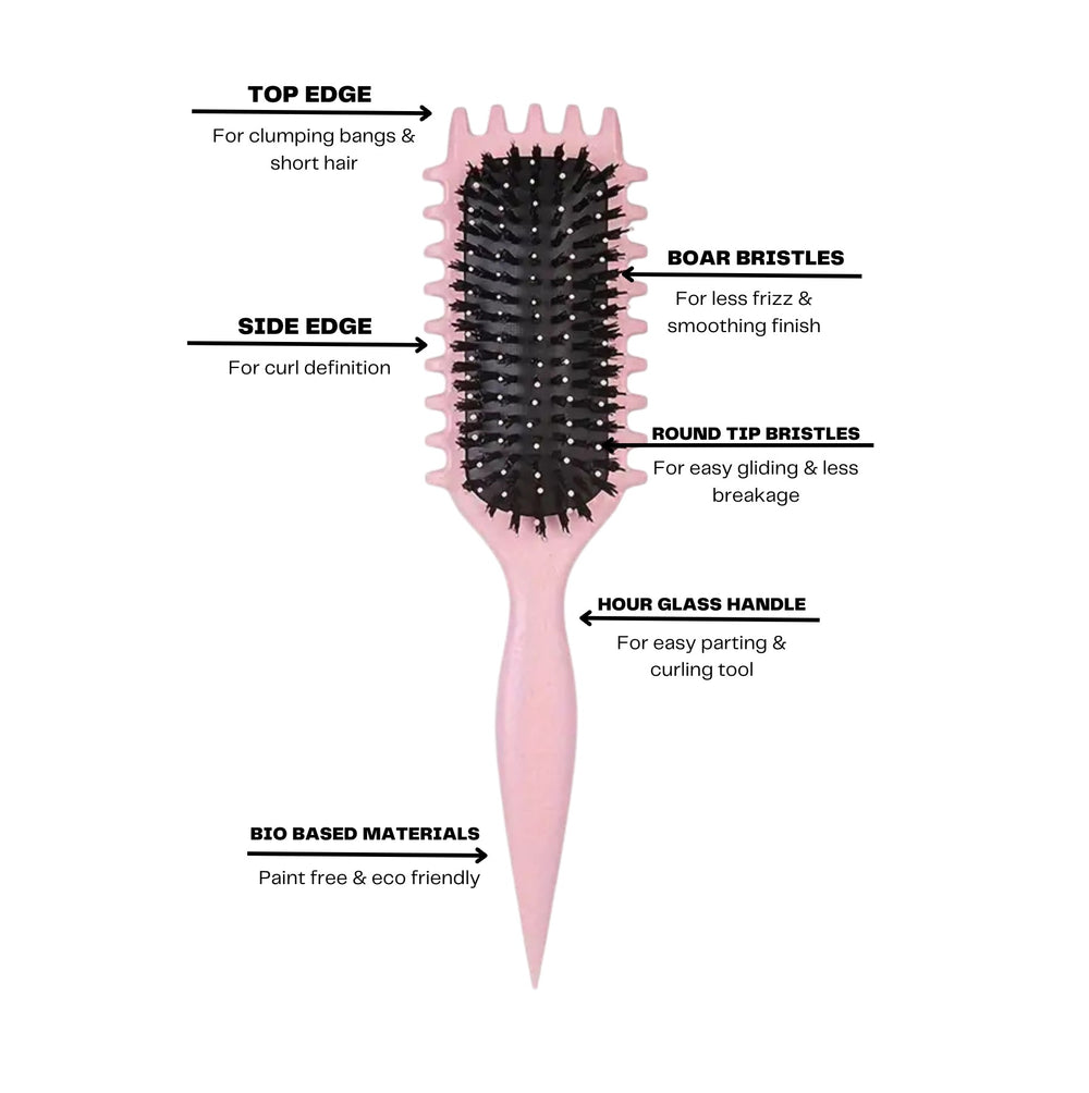 With its vegan boar bristles and flexible round-tip design, it glides effortlessly through your curls, reducing breakage and making styling a breeze. The hourglass handle even doubles as a parting tool and a heatless curling aid—how’s that for multitasking? 🌟 Plus, it’s made from eco-friendly, biodegradable materials, so you can feel good about your hair and the planet.